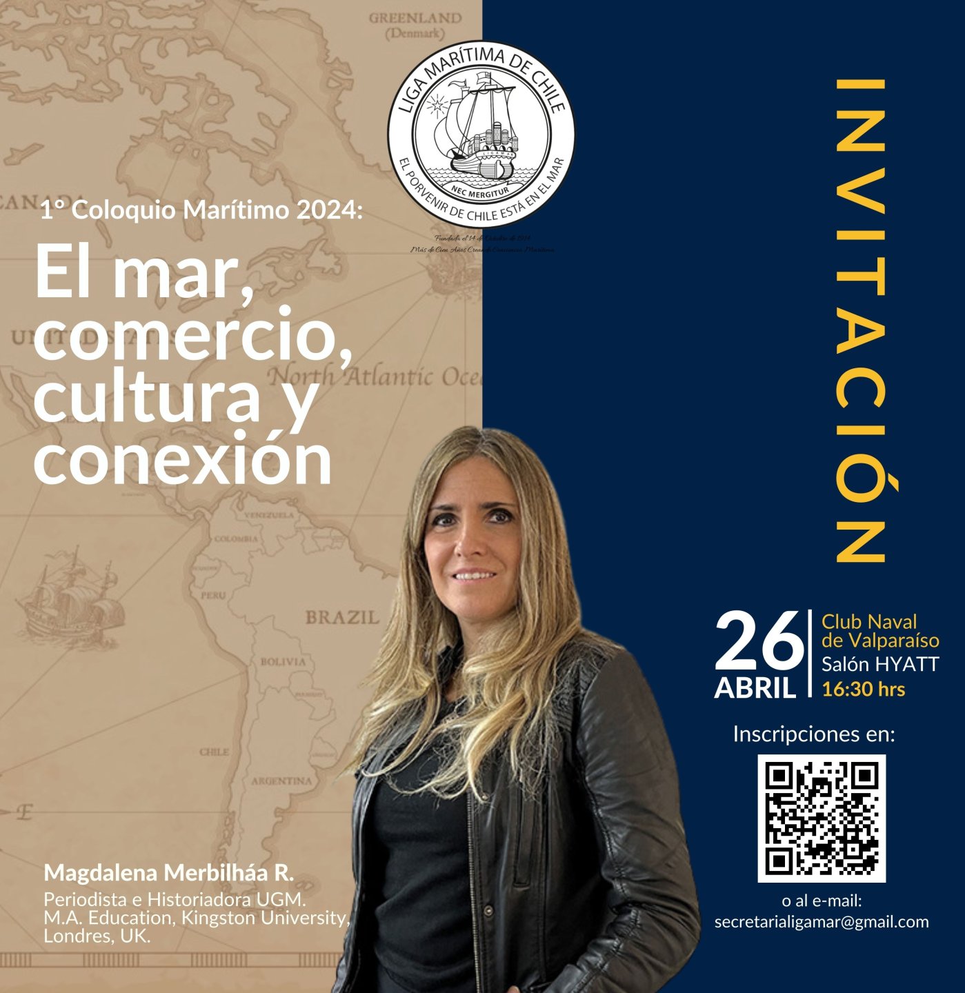 Como parte de sus actividades vinculadas a promover la conciencia sobre la importancia del mar para el desarrollo de Chile, Liga Marítima realizará su 1° Coloquio denominado " El mar, comercio, cultura y conexión", a cargo de la periodista e historiadora, Magdalena Melbrilháa, quien realizará su conferencia en el salón Hyatt del Club Naval de Valparaíso, el próximo viernes 26 de abril, a las 16:30 horas.
