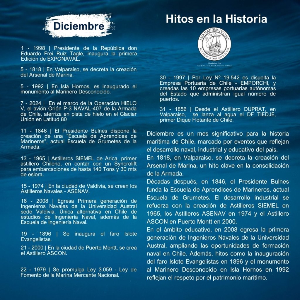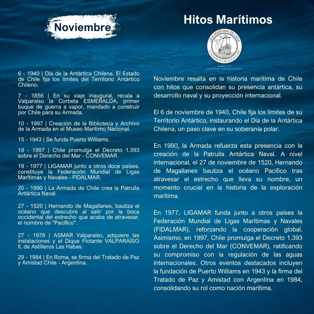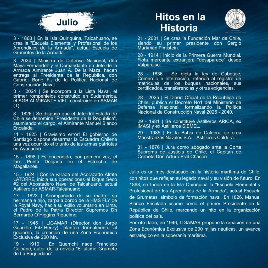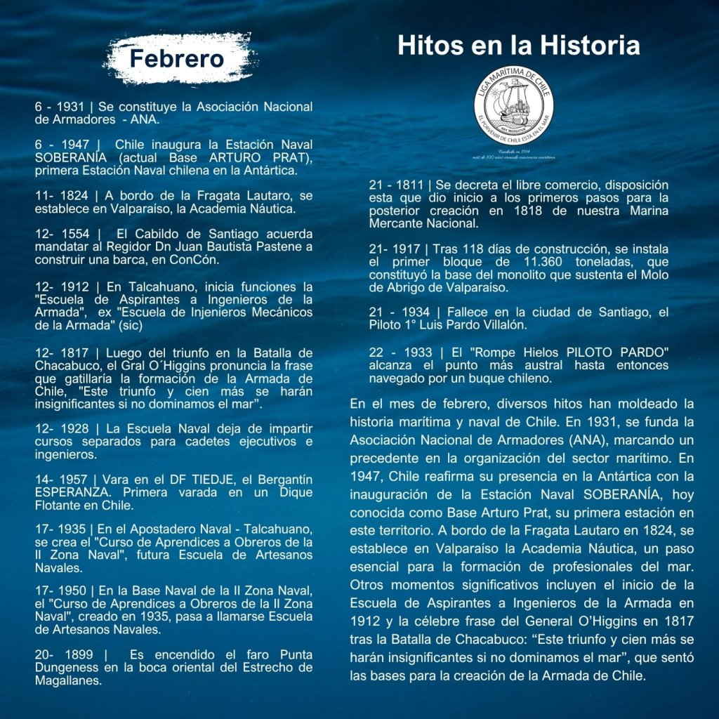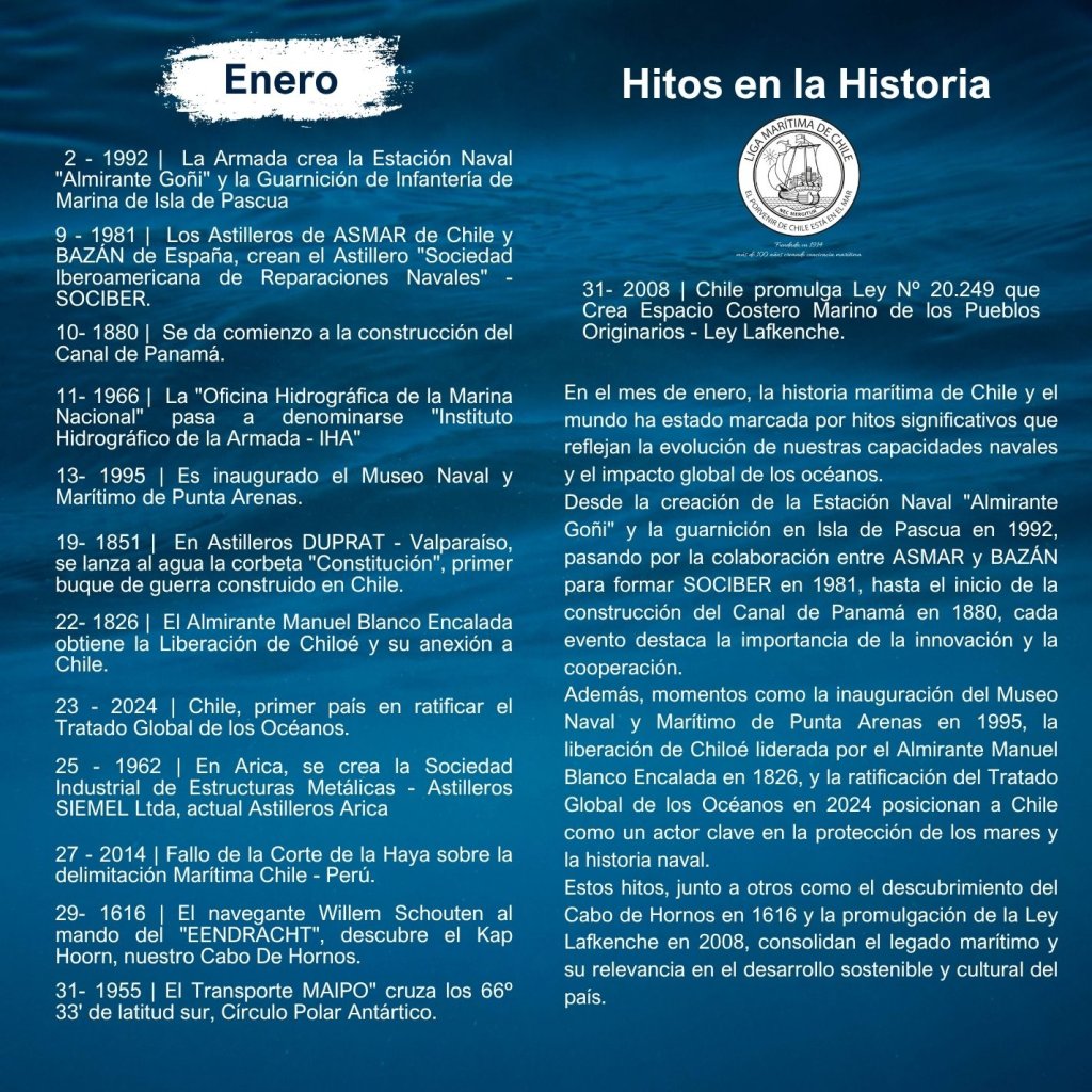 En la historia marítima de Chile, cada mes ha sido testigo de importantes hitos que han definido el desarrollo de nuestra identidad como nación marítima. Desde enero hasta diciembre, eventos trascendentales han marcado la evolución de nuestras capacidades navales, científicas, culturales y comerciales, reflejando la estrecha relación del país con el océano.