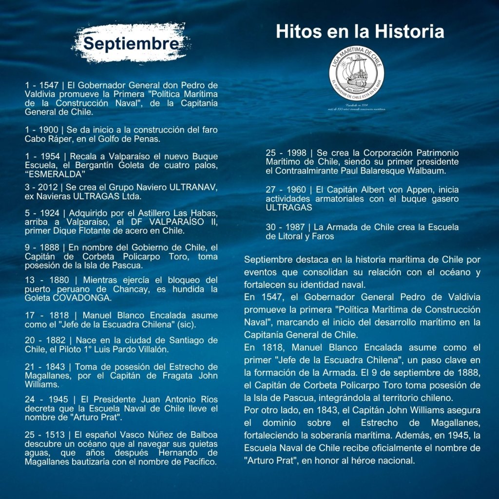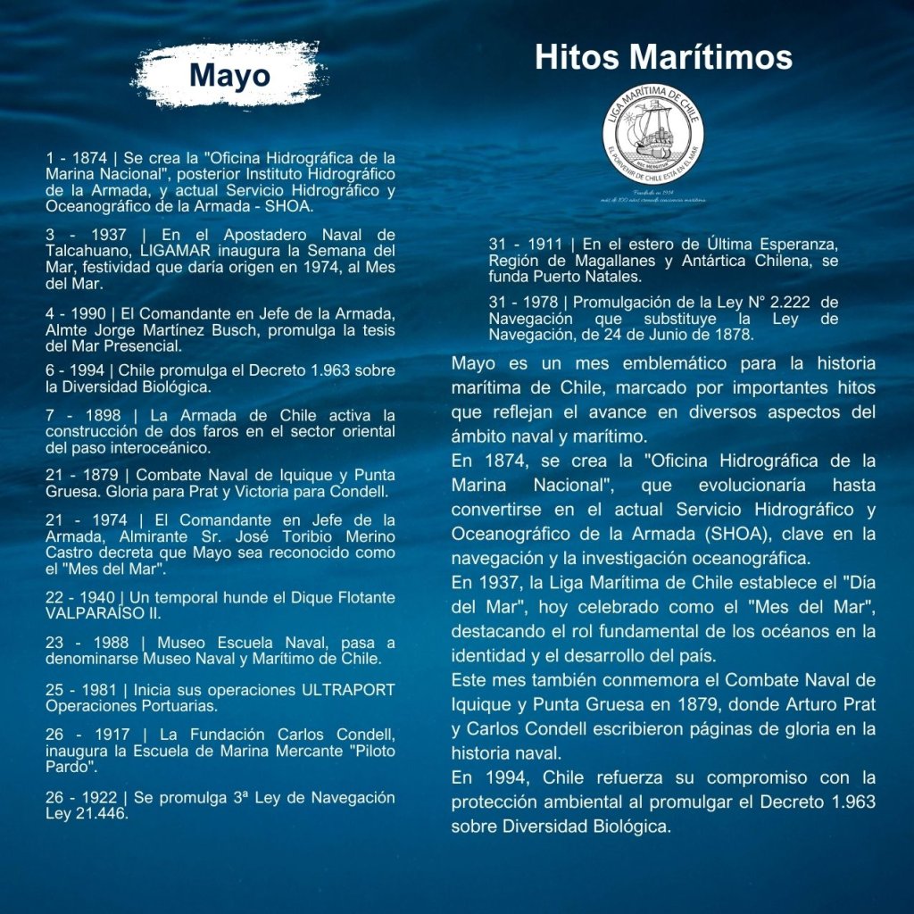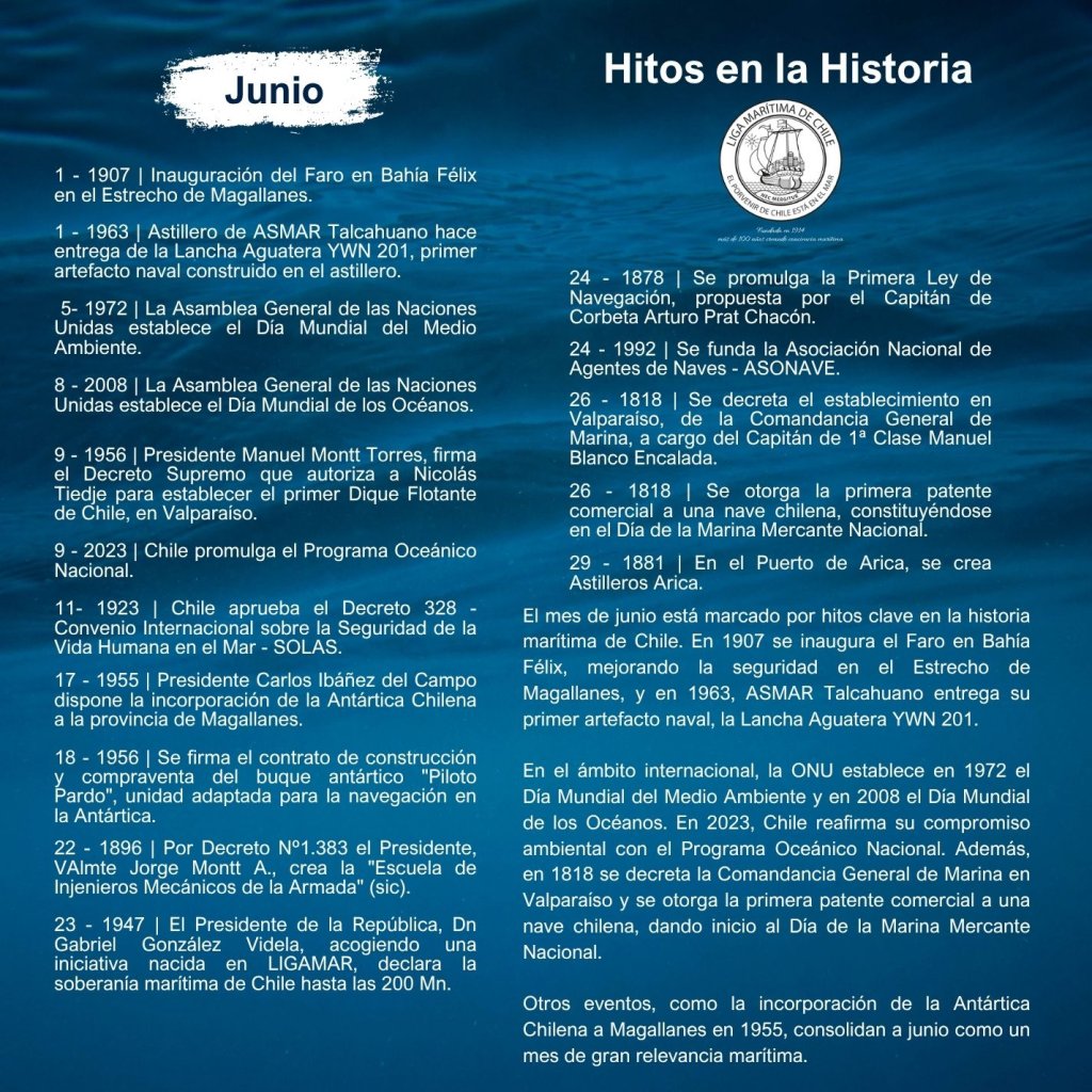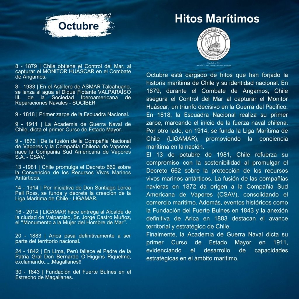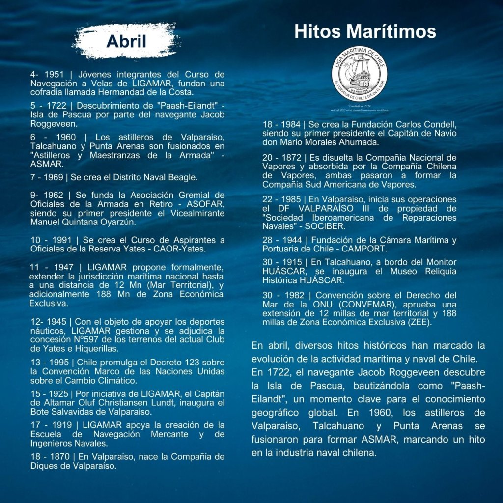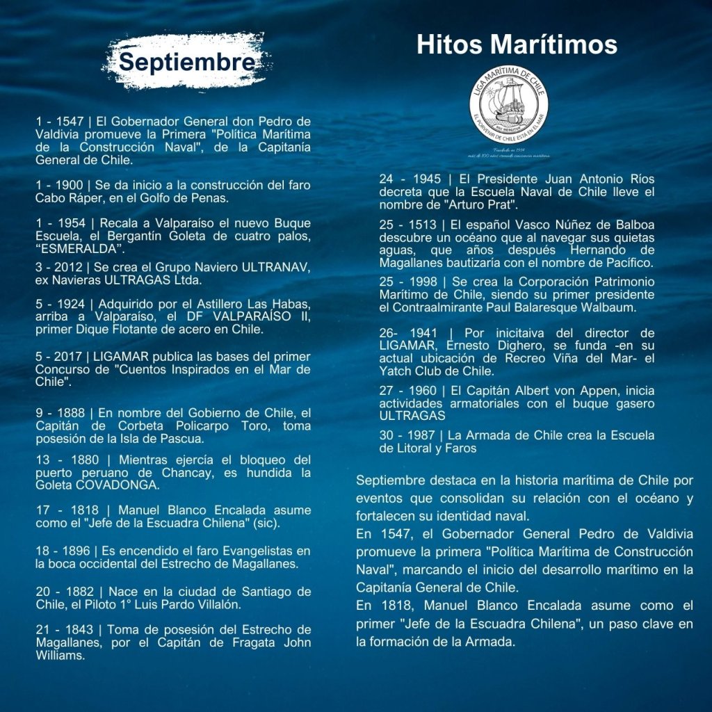 En la historia marítima de Chile, cada mes ha sido testigo de importantes hitos que han definido el desarrollo de nuestra identidad como nación marítima. Desde enero hasta diciembre, eventos trascendentales han marcado la evolución de nuestras capacidades navales, científicas, culturales y comerciales, reflejando la estrecha relación del país con el océano.