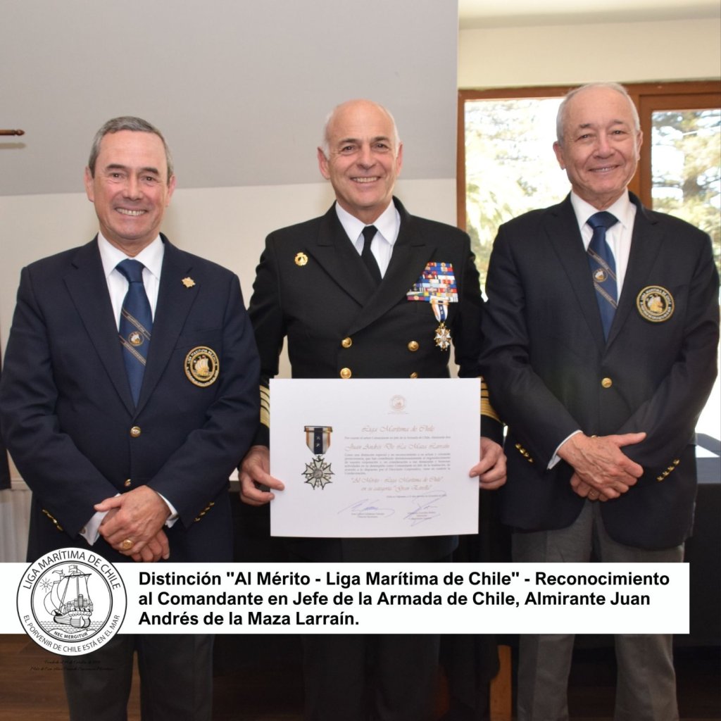 - Distinción "Al Mérito - Liga Marítima de Chile" - Reconocimiento al Comandante en Jefe de la Armada de Chile. El Almirante Juan Andrés de la Maza Larraín fue reconocido por su destacado apoyo a la Liga Marítima de Chile durante su singular periodo de 4 años como Comandante en Jefe de la Armada. Su colaboración constante con LIGAMAR ha sido fundamental para fortalecer la relación de la Armada con la sociedad civil y sus aportes a la defensa de los intereses marítimos.