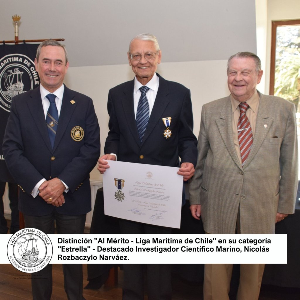 - Distinción "Al Mérito - Liga Marítima de Chile" en su categoría "Estrella" - Destacado Investigador Científico Marítimo. El Investigador Científico Marino Nicolás Rozbaczylo Narváez fue reconocido por su destacada trayectoria en la investigación marina, con un enfoque en la fauna marina y su impacto ecológico. Su trabajo, especialmente en el estudio de los poliquetos del Pacífico suroriental, ha sido crucial para el avance del conocimiento científico en la biología marina. Rozbaczylo es actualmente representante legal de FAUNAMAR.