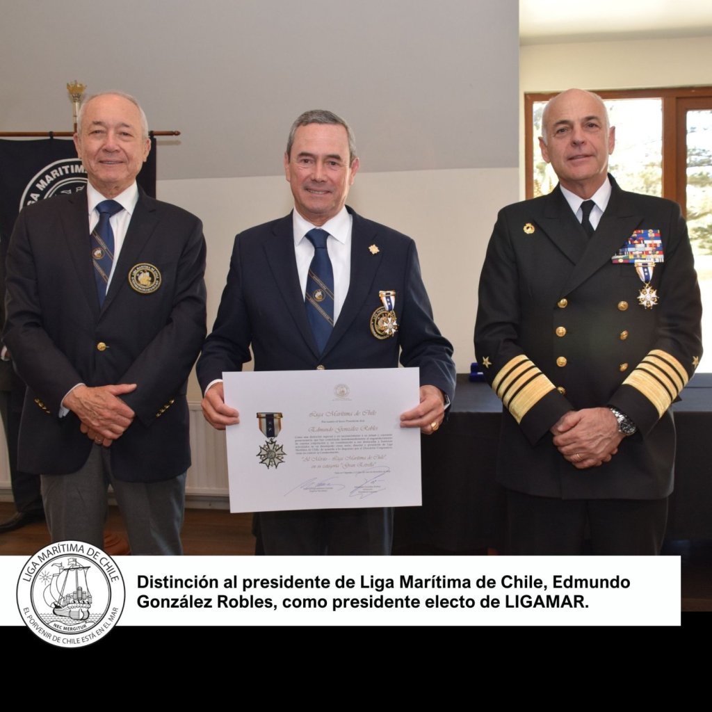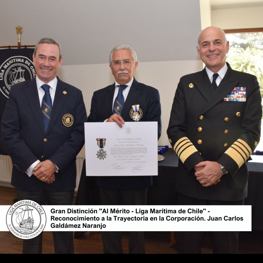 - Gran Distinción "Al Mérito - Liga Marítima de Chile" - Reconocimiento a la Trayectoria en la Corporación. Juan Carlos Galdámez Naranjo, por su destacada labor en el directorio de la Liga Marítima de Chile, recibió esta distinción tras más de 30 años de contribución al crecimiento y fortalecimiento de la institución. Su trabajo ha sido clave para la consolidación de la misión de la Liga Marítima en el país y su influencia en la agenda marítima.