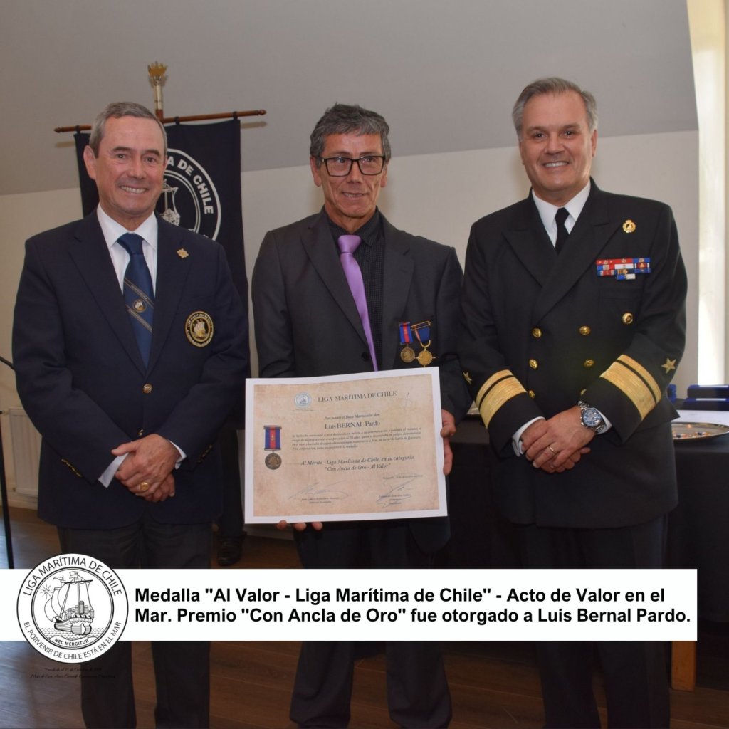 - Medalla "Al Valor - Liga Marítima de Chile" - Acto de Valor en el Mar. El premio "Con Ancla de Oro" fue otorgado a Luis Bernal Pardo por su acto heroico de salvar a un pescador en peligro de muerte durante una arriesgada operación de rescate en la Bahía de Quintero. Enfrentando condiciones extremas y con gran valentía, Bernal mostró un comportamiento ejemplar, poniendo en riesgo su propia vida para salvar a un semejante en el mar.
