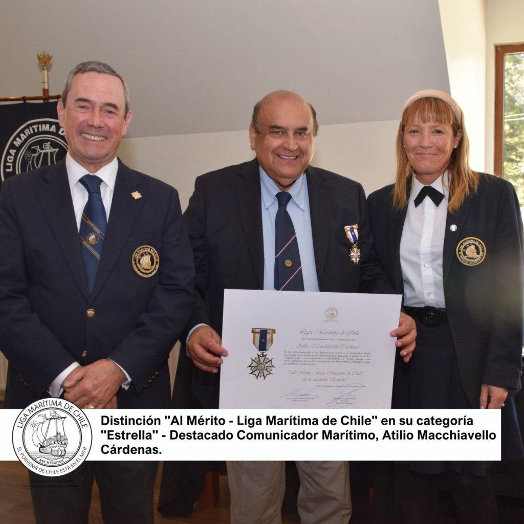 - Distinción "Al Mérito - Liga Marítima de Chile" en su categoría "Estrella" - Destacado Comunicador Marítimo. Atilio Macchiavello Cárdenas, periodista y fundador de la empresa Océano, fue reconocido por su contribución a la comunicación marítima y portuaria en Chile. Con más de 18 años de trayectoria, Macchiavello ha sido un ferviente defensor de los intereses marítimos en los medios, ayudando a crear un puente entre la industria y la sociedad, y promoviendo el conocimiento sobre la actividad marítima en Chile.