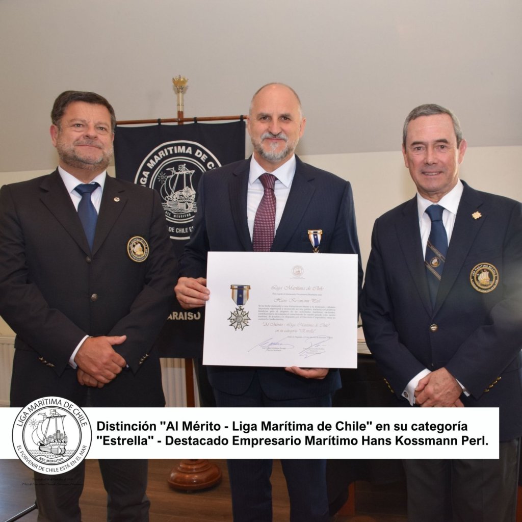 - Distinción "Al Mérito - Liga Marítima de Chile" en su categoría "Estrella" - Destacado Empresario Marítimo. Este reconocimiento fue otorgado a Hans Kossmann Perl, un empresario con una dilatada trayectoria en el sector marítimo, cuyo liderazgo y contribución al desarrollo de la industria naviera nacional han sido esenciales para el avance del sector. Kossmann es actualmente presidente del Directorio de ASENAV - Astilleros y Servicios Navales S.A., y ha sido un pilar fundamental en la expansión de la infraestructura marítima en Chile.
