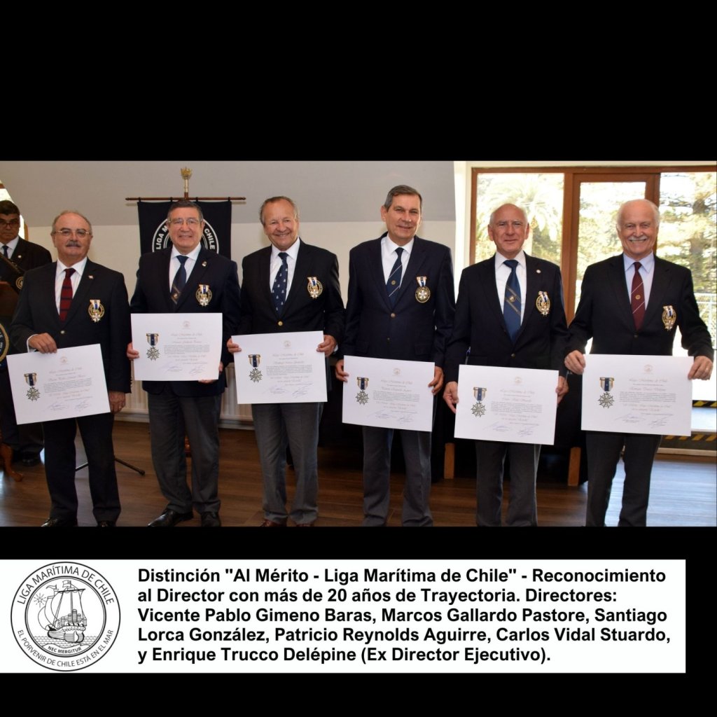 - Distinción "Al Mérito - Liga Marítima de Chile" - Reconocimiento al Director con más de 20 años de Trayectoria. Se entregó a los siguientes directores por su incansable dedicación a la causa marítima de Chile, con más de 20 años en el directorio de la corporación.