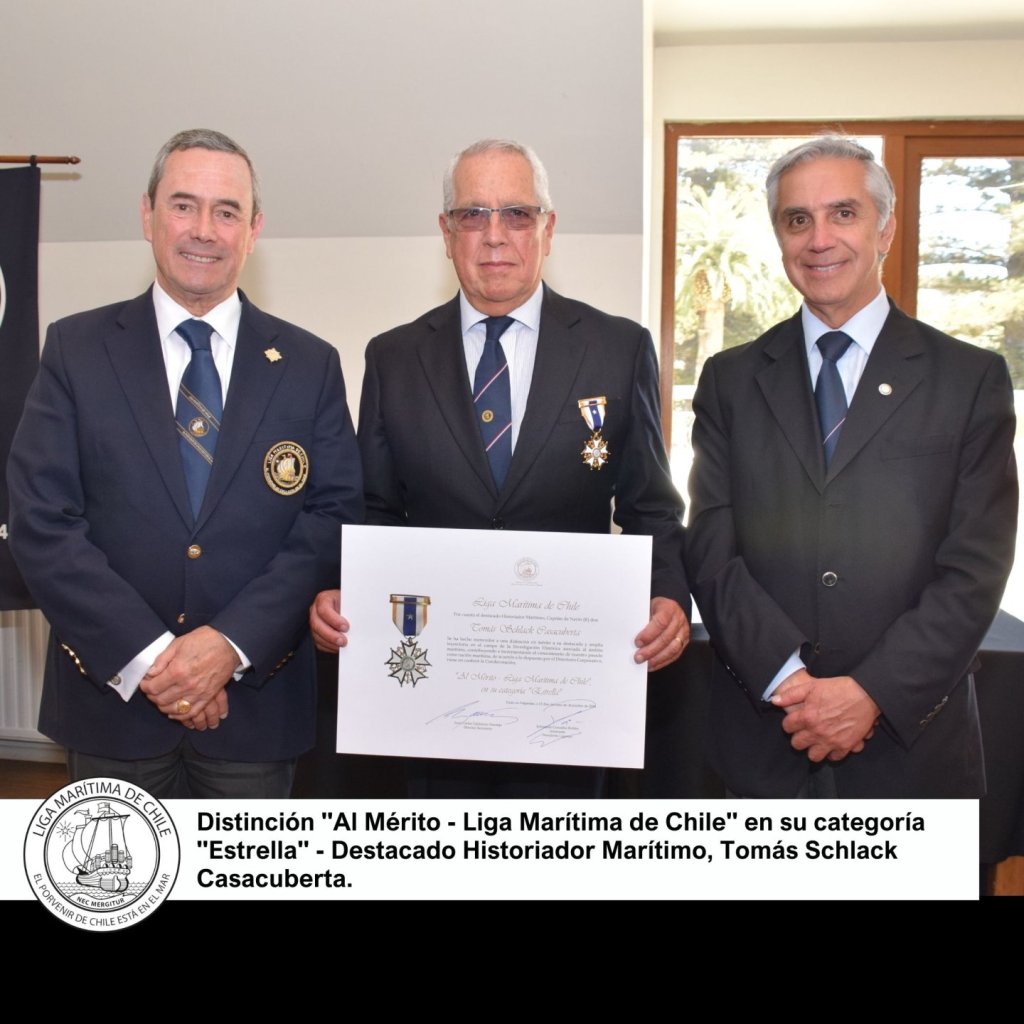 - Distinción "Al Mérito - Liga Marítima de Chile" en su categoría "Estrella" - Destacado Historiador Marítimo. El historiador Tomás Schlack Casacuberta fue galardonado por su valiosa labor en la difusión de la historia naval y marítima de Chile. Con una destacada carrera como conferencista y escritor, Schlack ha sido una figura clave en la preservación y divulgación del legado marítimo de Chile, contribuyendo a la formación de nuevas generaciones interesadas en el mar y la historia naval.