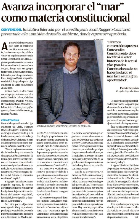 Nuestro vicepresidente, Patricio Reynolds Aguirre, da cuenta de los avances de esta iniciativa al interior de la Convención Constitucional, gracias al apoyo de un grupo transversal de Constituyentes liderados por el Convencional Ruggero Cozzi Paredes, quienes conociendo la importancia de enmendar este error histórico que existe en la actual y anteriores Constituciones de no contemplar la protección y resguardo de El Mar, han sido los portavoces de este desafío de la Liga Marítima de Chile que ya tiene más de 4 años de trabajo detrás.