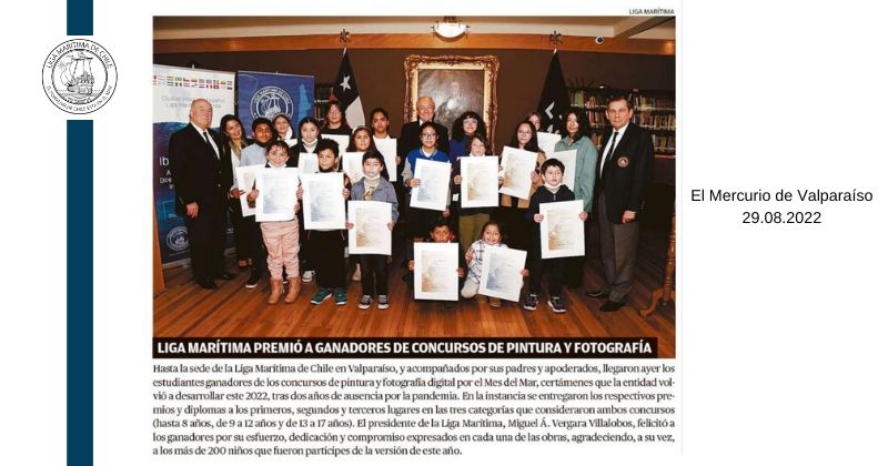 En la edición de hoy -viernes 29 julio 2022- de El Mercurio de Valparaíso, la premiación a los ganadores de los Concursos de Pintura y Fotografía Digital de Liga Marítima de Chile, oportunidad en la que los galardonados concurrieron acompañados por sus padres y apoderados.