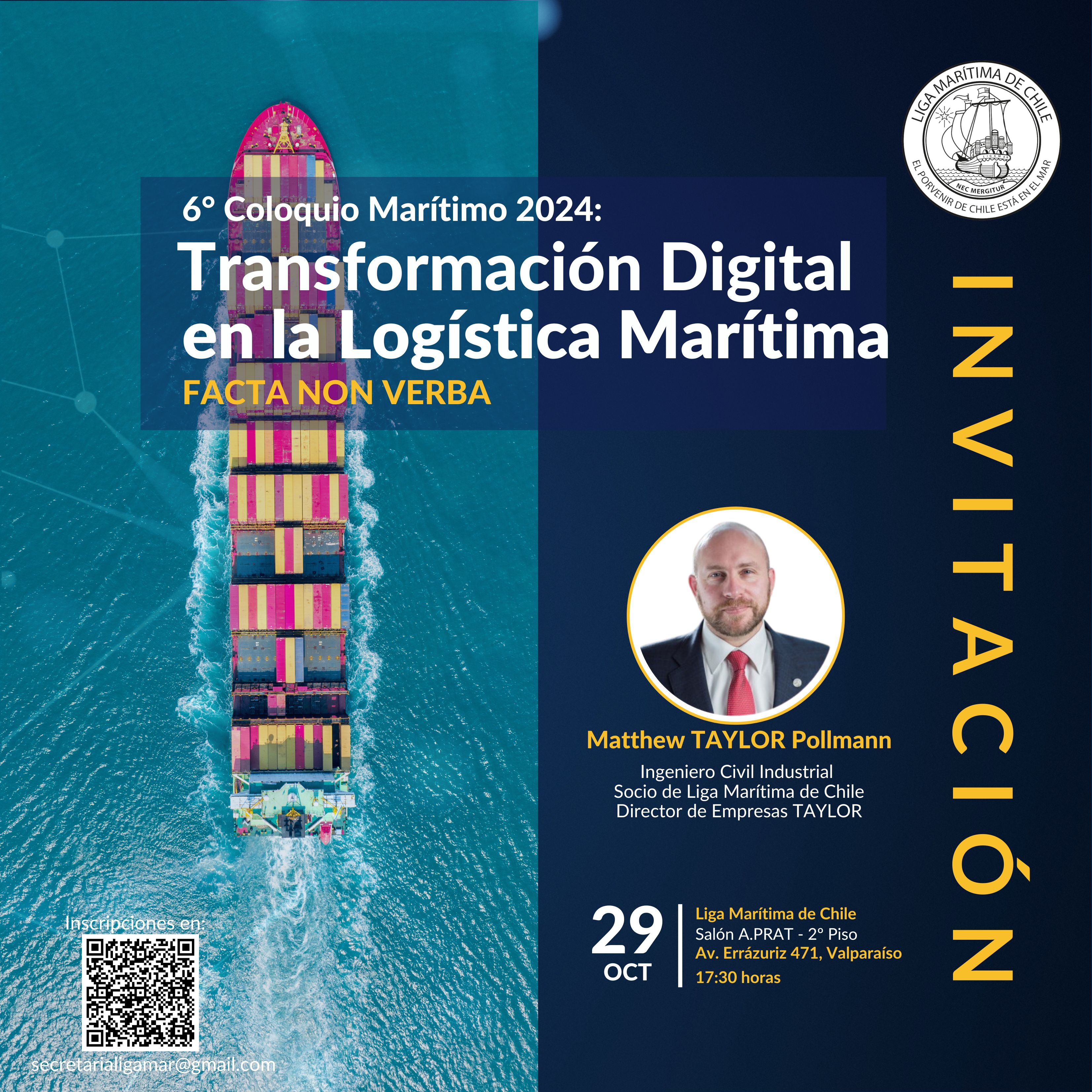 El Coloquio estará a cargo de Matthew Taylor Pollmann, Ingeniero Civil Industrial, socio de la Liga Marítima de Chile y Director de Empresas Taylor, quien compartirá su visión y experiencia sobre la integración de tecnologías avanzadas en la logística marítima. La charla abordará cómo la transformación digital puede optimizar la eficiencia operativa, mejorar la sostenibilidad y fortalecer la competitividad del sector en un entorno global cada vez más exigente.