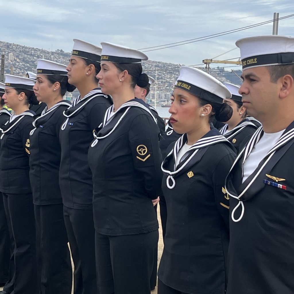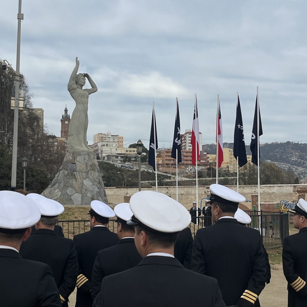 Posteriormente, se realizó una colocación de ofrendas florales en el monumento que recuerda a la mujer del marino, símbolo de quienes acompañan silenciosamente la vocación naval desde el hogar. El acto destacó la importancia de la familia como pilar emocional y ético de las dotaciones navales, reforzando su rol fundamental en la mantención del compromiso patriótico de los marinos.
