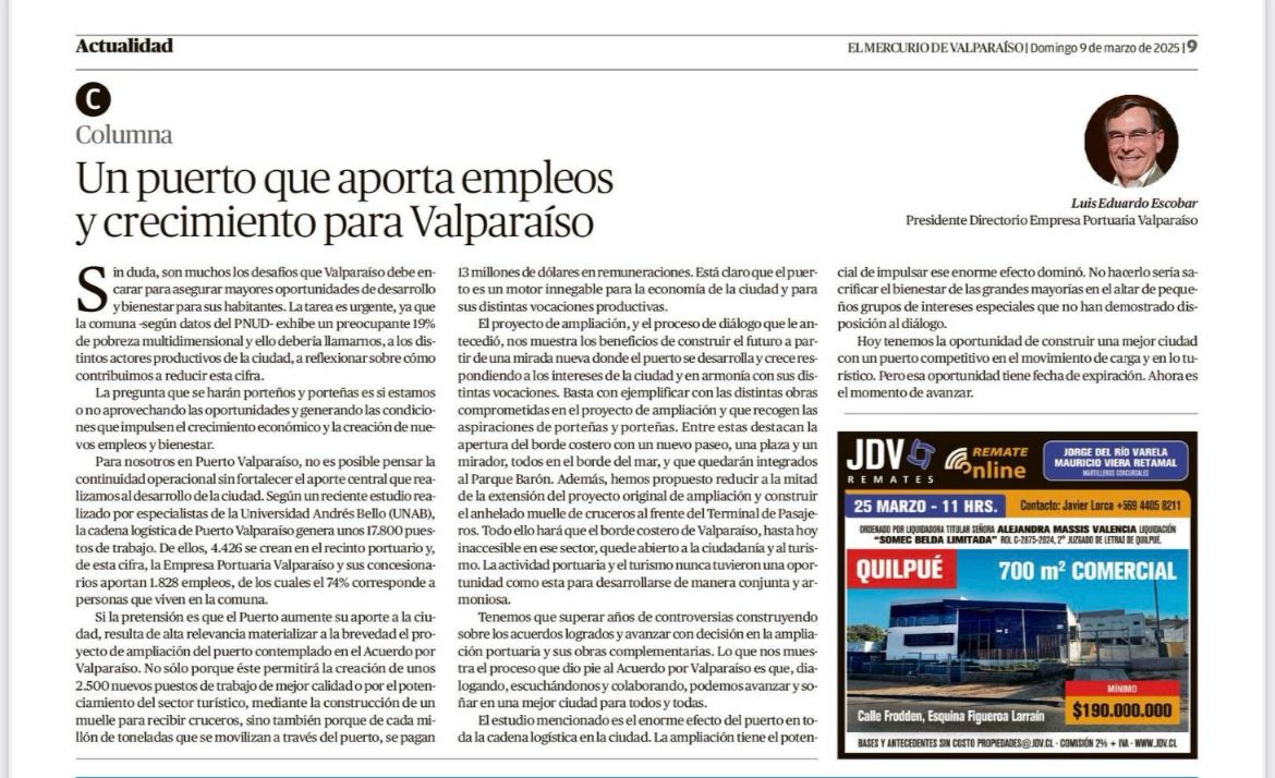Por Luis Eduardo Escobar. Presidente Directorio de Empresa Portuaria de Valparaíso.
