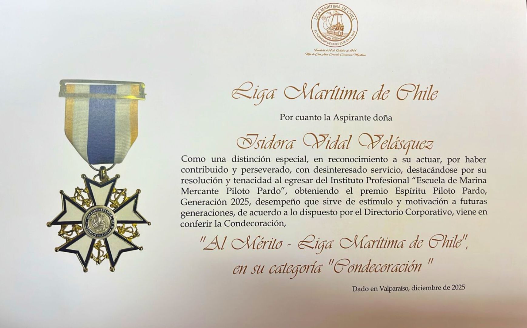 El reconocimiento 'Al Mérito' fue entregado por el presidente de Liga Marítima de Chile, Almirante Edmundo González Robles, a la aspirante Isidora Vidal Velásquez, egresada del Instituto Profesional Escuela de Marina Mercante “Piloto Pardo”, generación 2025.